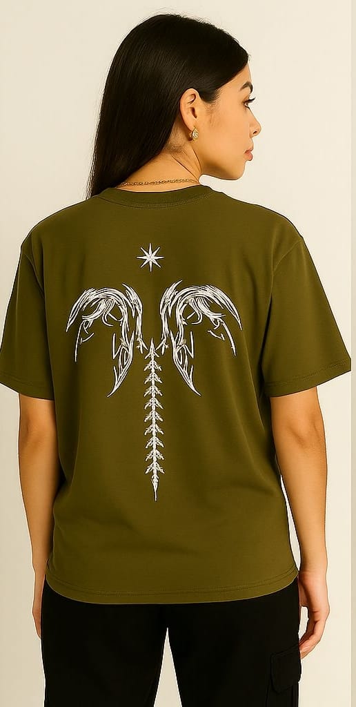 Make a statement with calm confidence. This Olive green Oversized T-shirt is crafted from 240 GSM premium French Terry cotton, offering a luxurious blend of structure, softness, and lasting comfort. The front design features elegant birds in flight enclosed within a circular motif, representing freedom, balance, and harmony — perfect for those who carry peace and expression in their style. Ideal for casual wear, creative days, or relaxed evenings, this oversized tee pairs effortlessly with denim, cargo pants, or sneakers for a cool, contemporary streetwear look.