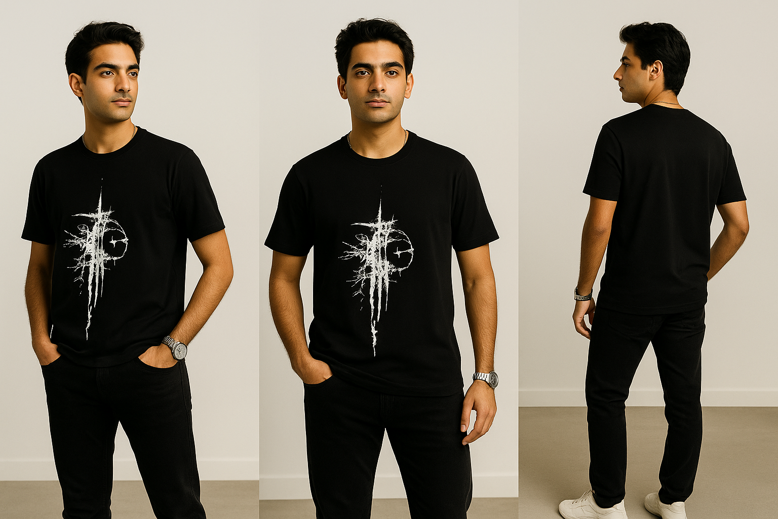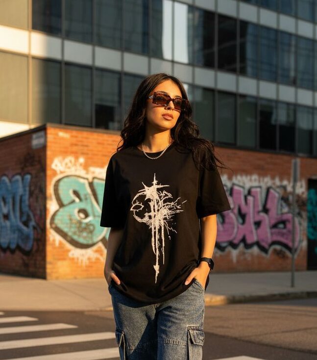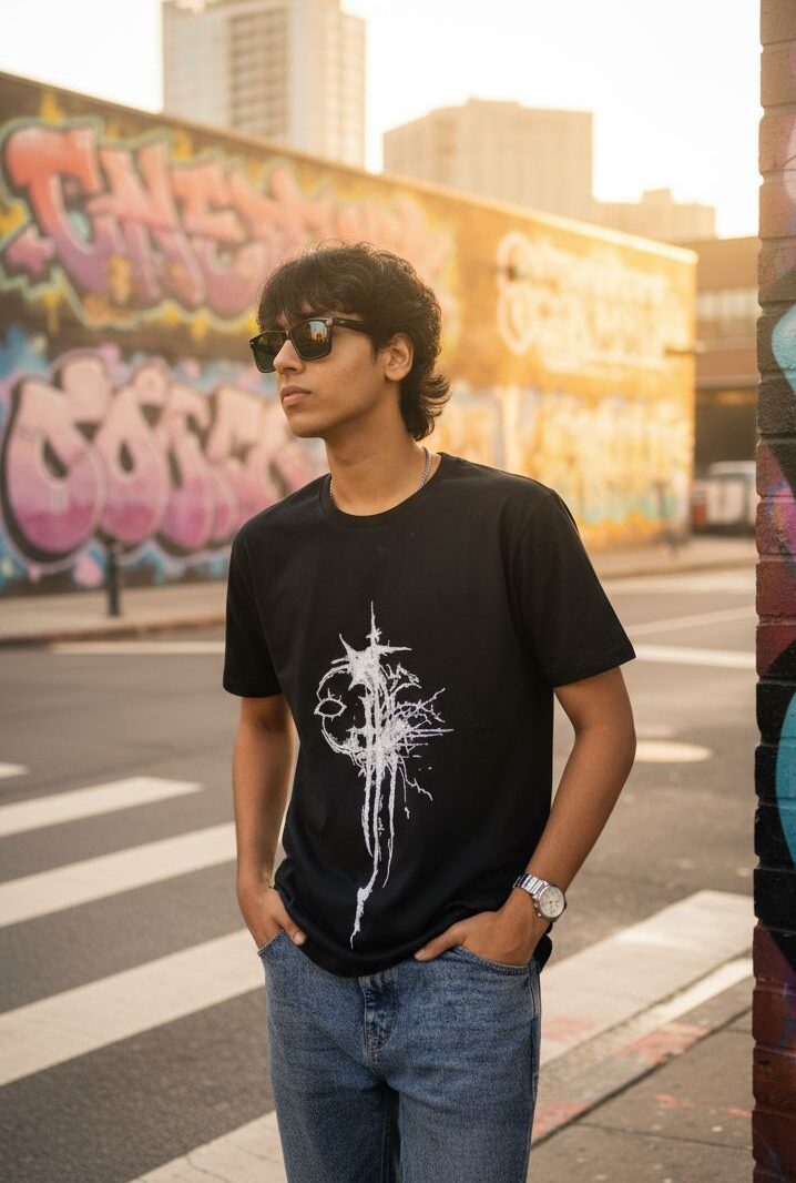 Whether you’re pairing it with cargo pants, denim, or layering it under a jacket, this black tee offers a versatile and elevated aesthetic that fits every vibe — from casual dayouts to night-time hangs.
