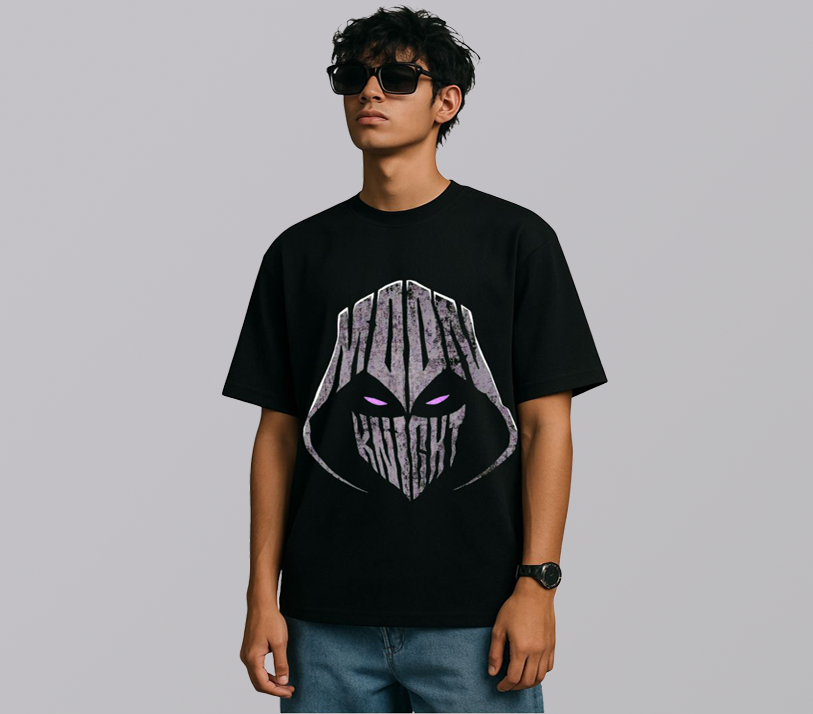 Step into the night with the Lunar Vigilante tee—crafted from premium 240 GSM cotton for a relaxed oversized fit. Featuring a bold Moon-Knight inspired graphic with striking violet eyes, this all-black T-shirt adds a mysterious edge to any streetwear lineup. Pair it with cargos or denim for a look that’s sharp day or night.