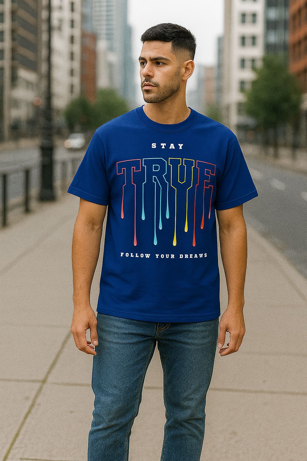 The vibrant, multi-color “TRUE” print with dripping design adds a powerful visual impact, while the “Follow Your Dreams” message inspires you to stay committed to your path.